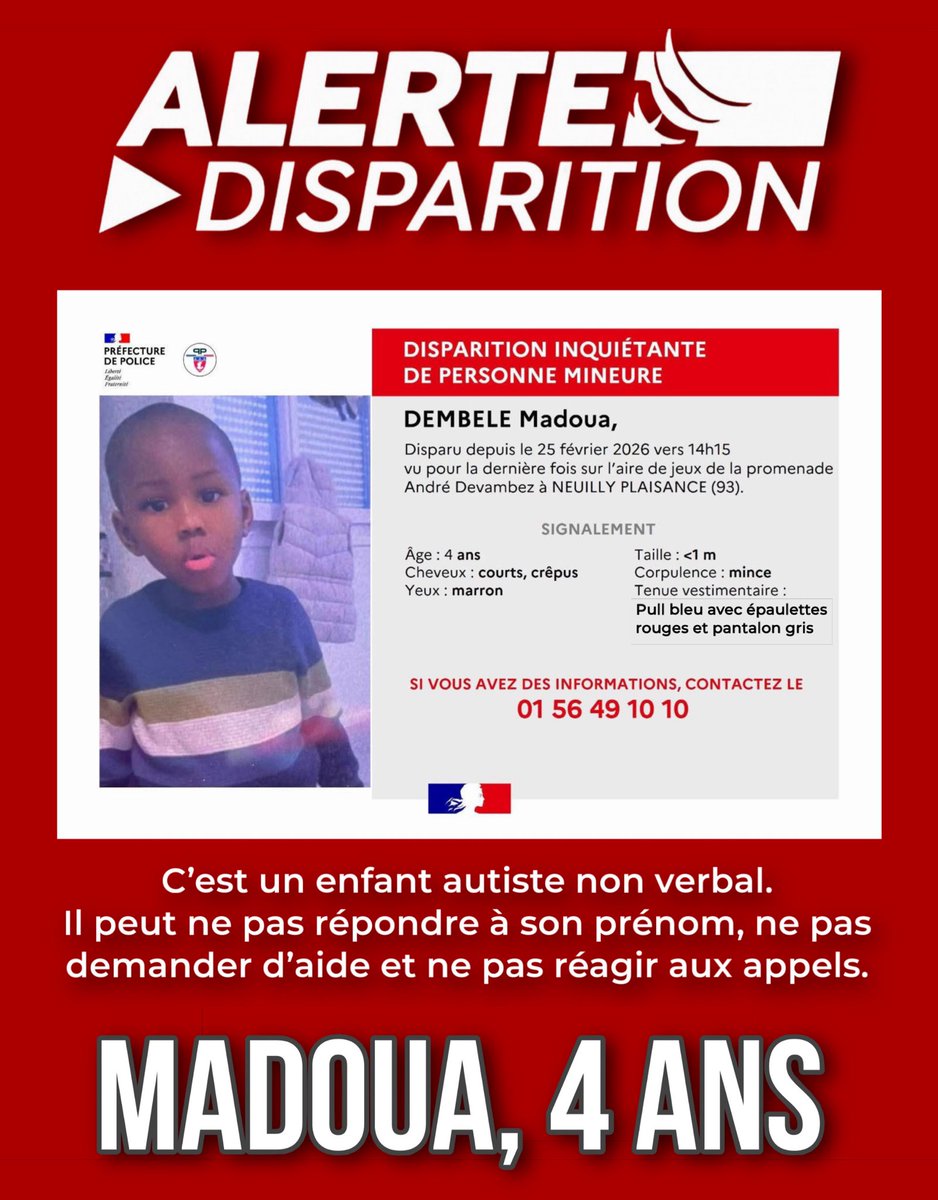 Disparu depuis le 25 février 2026, vu pour la dernière fois sur l'aire de jeux de la promenade André Devambez à Neuilly Plaisance.